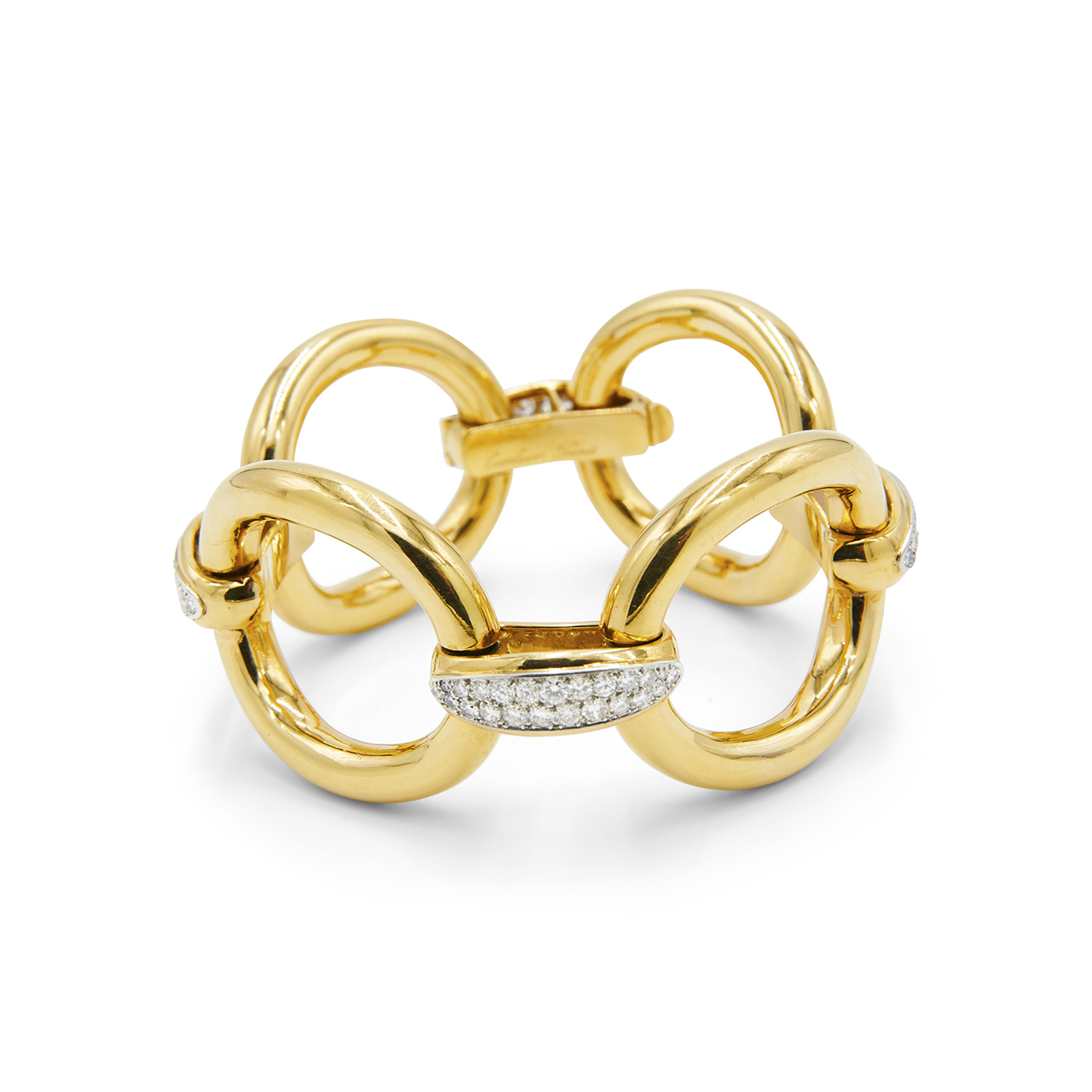 Large scale oval links in 18 karat yellow gold are joined with pavé links set with round diamonds totaling approximately 5 carats. Signed and numbered Cartier Paris. Circa 1970s.