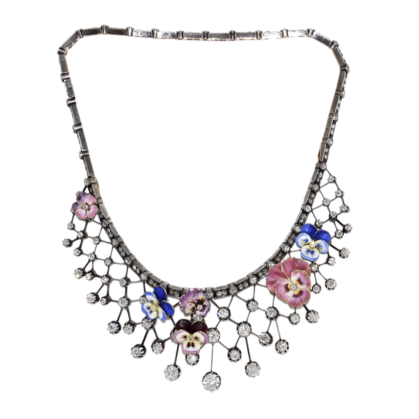 A lattice design bib necklace is set with a total of approximately 18.50 carats of old European and rose cut diamonds mounted in silver topped yellow gold with French hallmarks. The original necklace has been accented by Fred Leighton with the addition of small antique multi-color enamel pansy flowers. Necklace, circa 1880s, flowers, early 20th century.