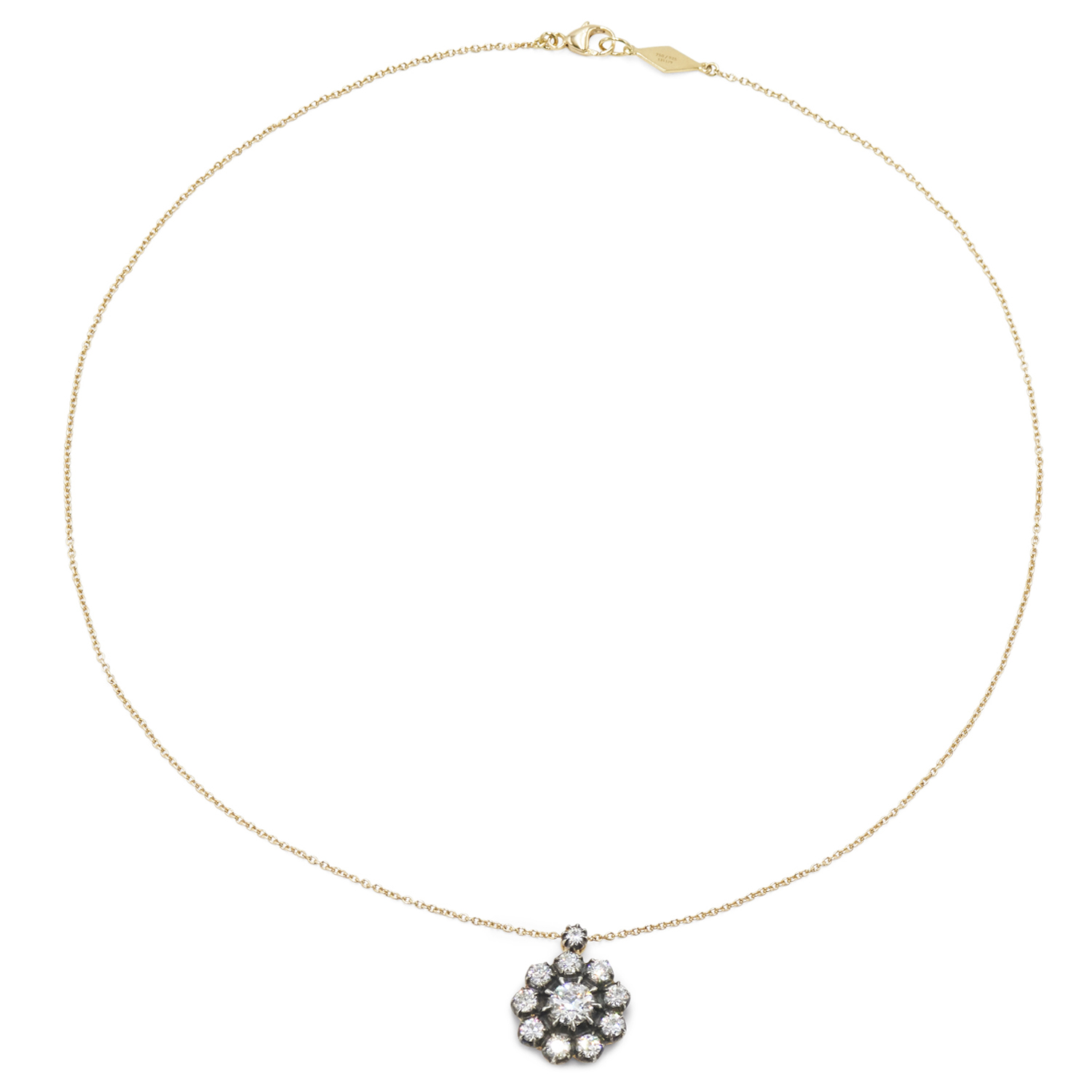A cluster pendant centers on a Fred Leighton Round® Diamond weighing 0.68 carat accented by a surround with a total of approximately 1.01 carats mounted in silver topped 18 karat yellow gold, suspended on a fine chain measuring 16 inches in length. Signed Fred Leighton.