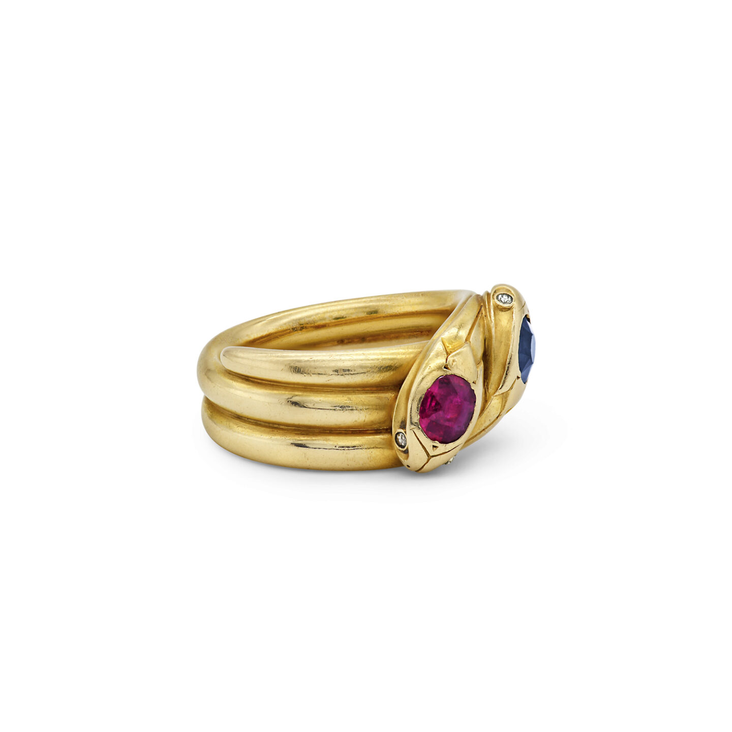 This antique French ring spotlights two snakes, one with a ruby on its head and one with a sapphire, coiled together in glimmering 18K yellow gold.