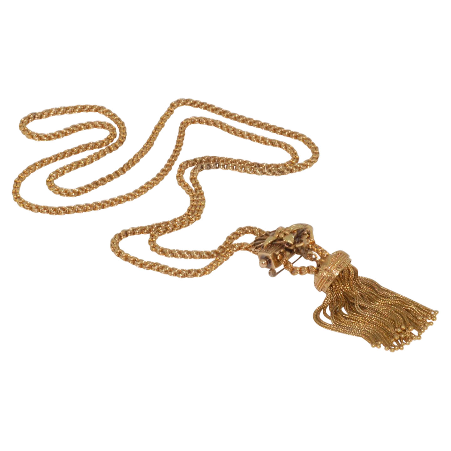A tassel slide with foliate motifs is suspended on a fancy link chain in 14 karat yellow gold. Circa 1880s.